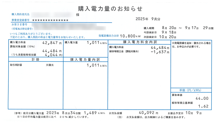 2025年9月の太陽光発電 売電結果