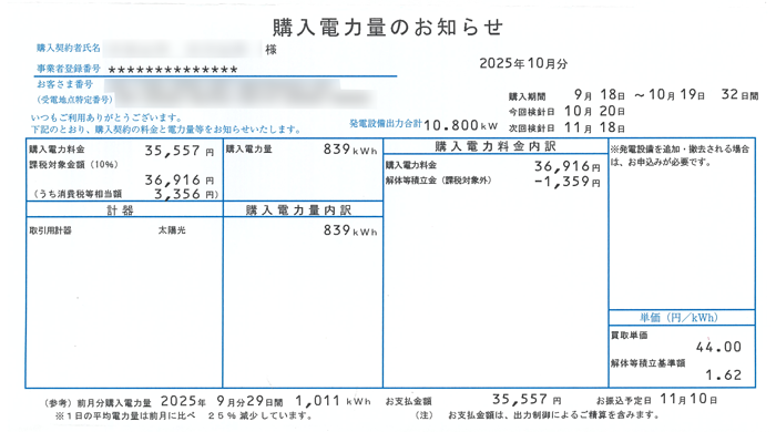 北九州市小倉北区 N様邸 売電額の推移(令和7年10月分)